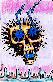 They play their strange instruments under two every time more ardent Suns: their legs get enlarged like octopuses of destiny: stolen cans of beer are thrown, empty, to the stage like a blinding-metallic rain: someone recites a pamphlet on through a silvery megaphone, a whistle sounds shattering the sky in 1008 pieces: the noise is unbearable.